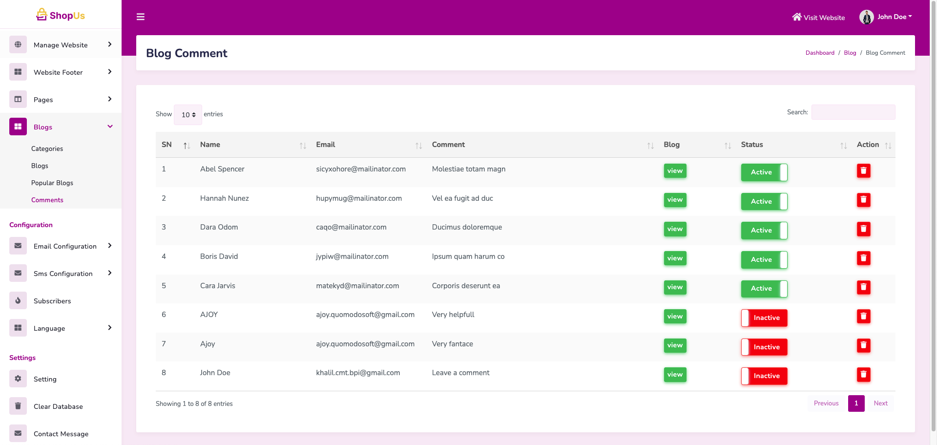 Blog Comment can be manage from the admin panel. Go to "Blogs >> Comments" from sidebar. See: