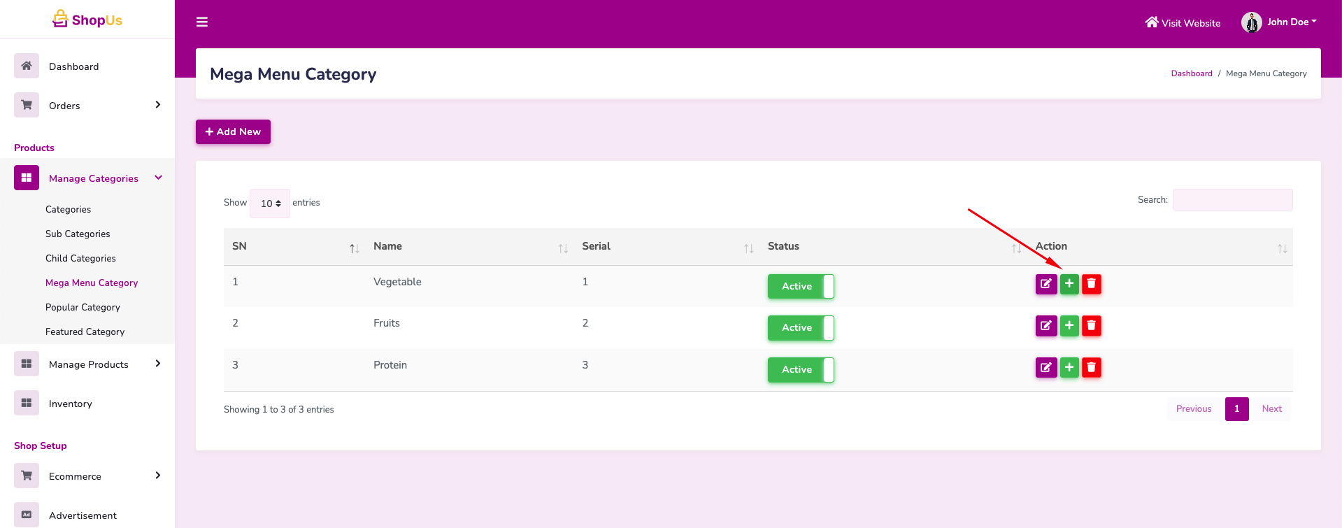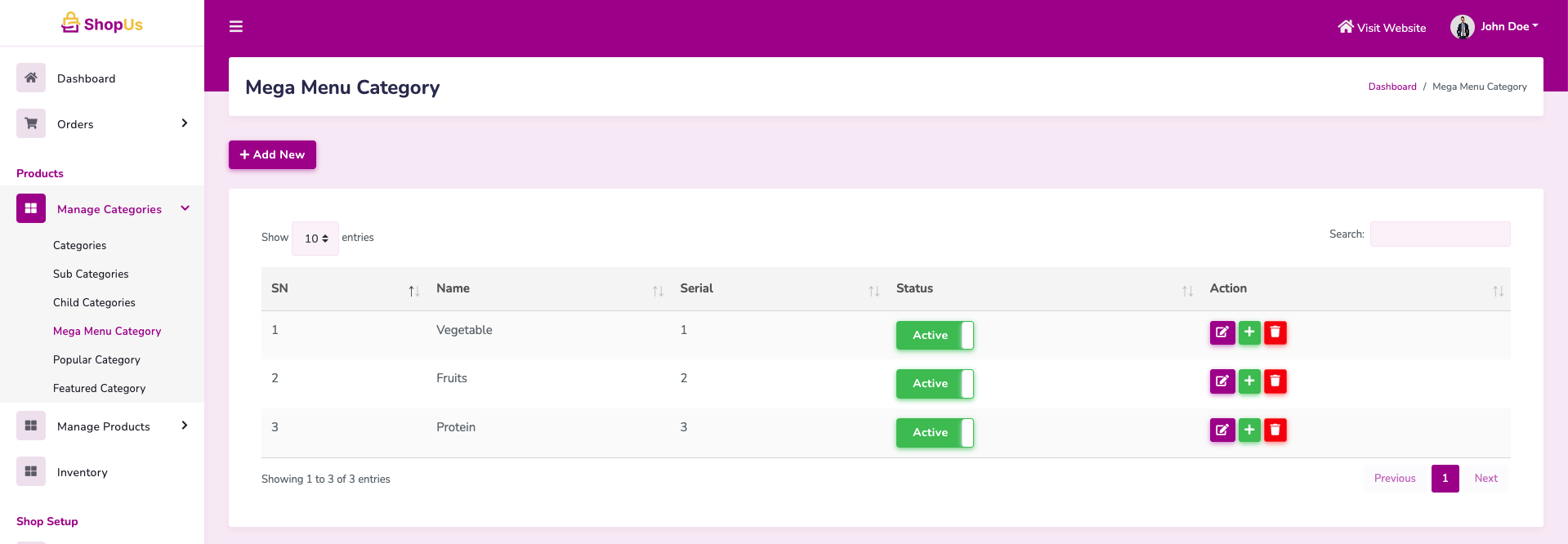 Mega menu category can be manage from the admin panel. Go to "Manage Categories >> Mega menu category" from sidebar. See: