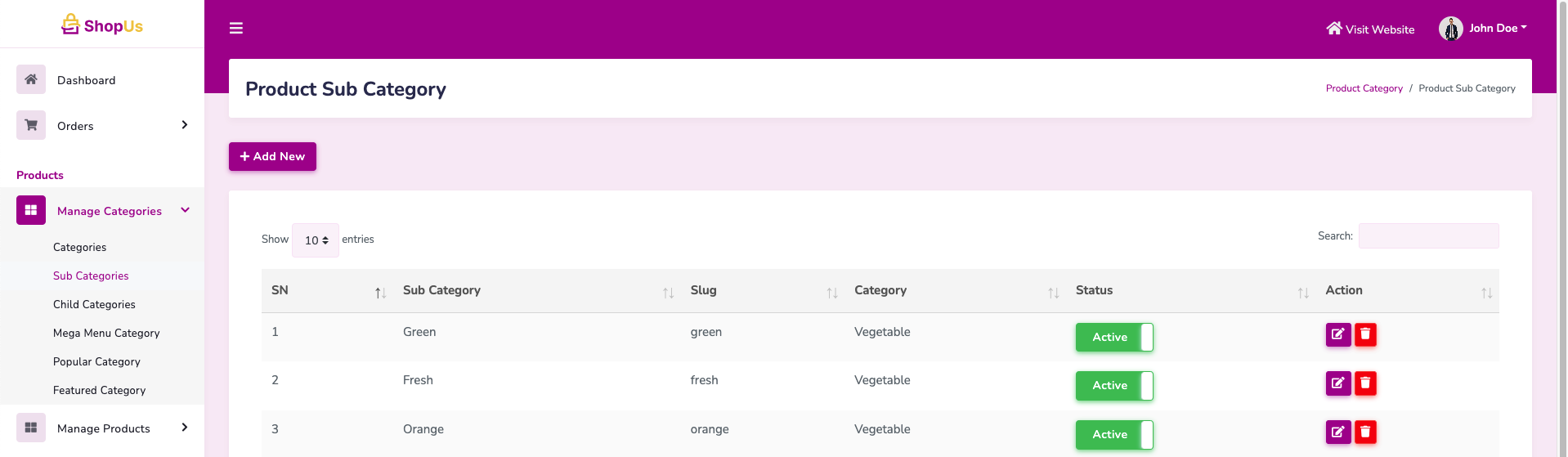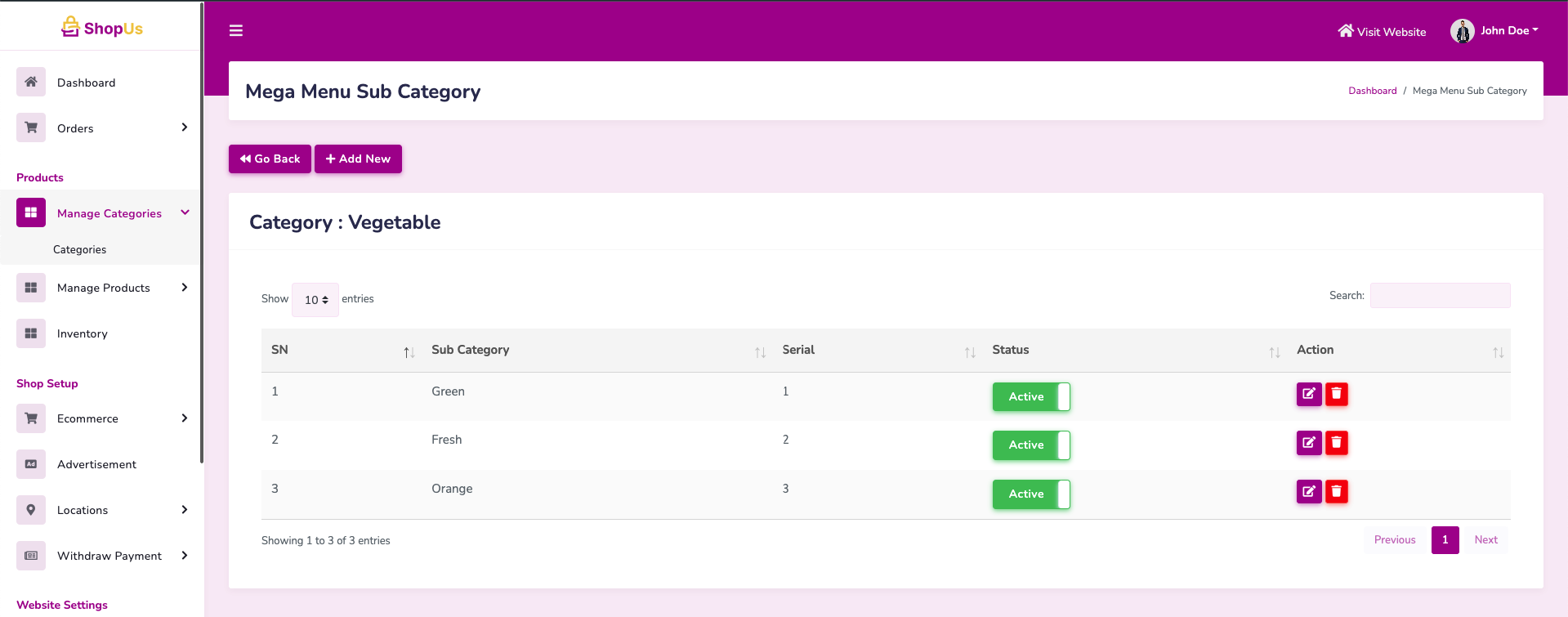 Mega menu sub category can be manage from the admin panel. Go to "Manage website >> Mega menu" from sidebar. See: