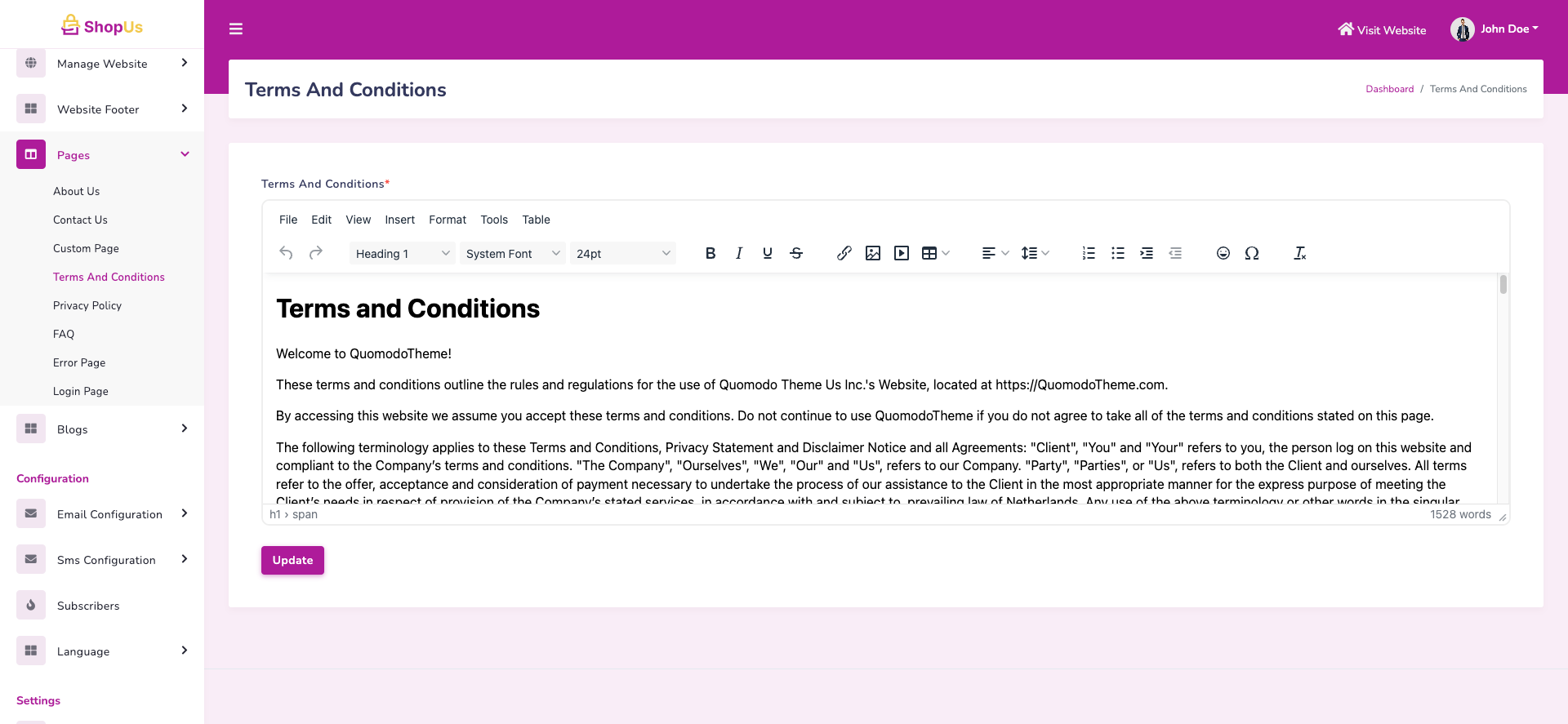 Terms and Conditions Page can be manage from the admin panel. Go to "Pages >> Terms and Conditions" from sidebar. See: