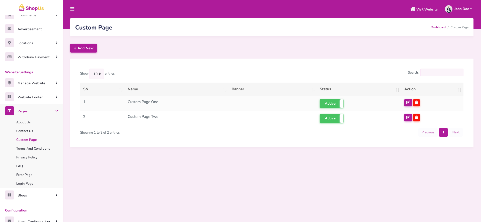 Custom Page can be manage from the admin panel. Go to "Pages >> Custom Page" from sidebar. See: