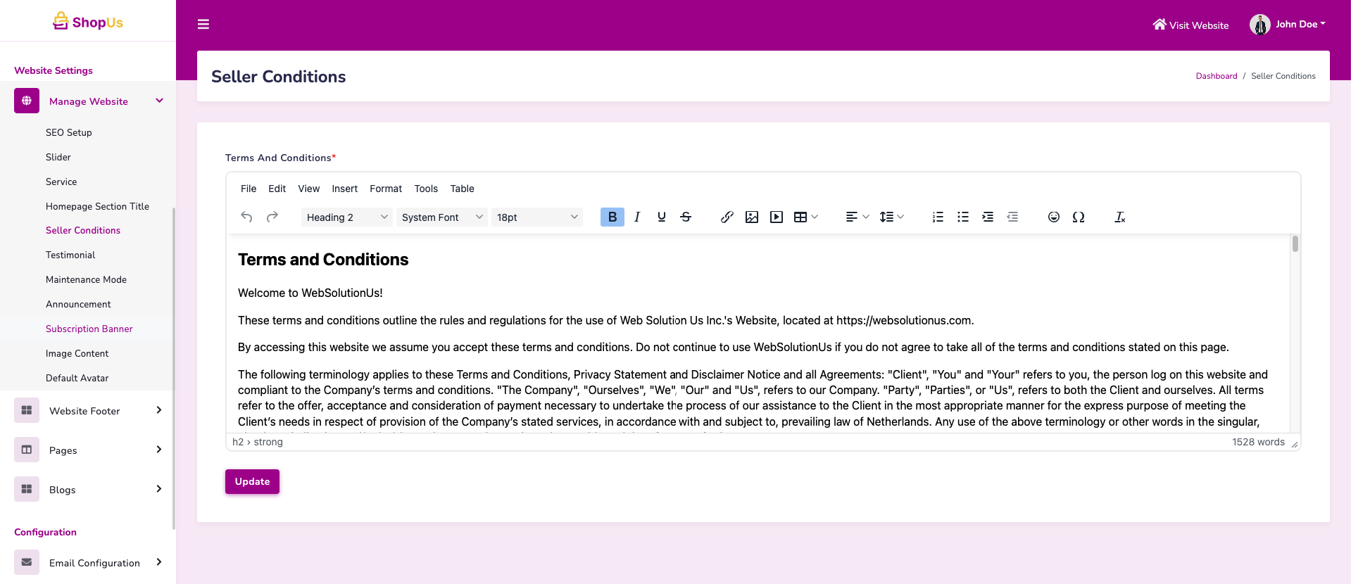 Seller Terms and conditions can be manage from the admin panel. Go to "Manage website >> Seller Condition" from sidebar. See: